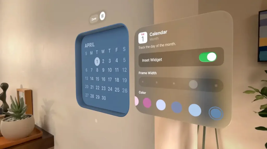 • Widgets prsistentes: Podremos colocar Widgets (Reloj, Tiempo, Música, etc.) en nuestro espacio físico, incluso alineados con superficies como paredes o mesas, y permanecerán ahí cada vez que nos pongamos el visor.